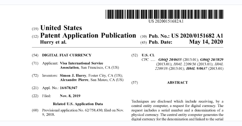 Americký úrad pre patenty a ochranné známky (USPTO) zverejnil v štvrtok patentovú prihlášku s názvom „digitálna mena fiat“, ktorú podala spoločnosť Visa International Service Association. Žiadosť bola podaná 8. novembra 2019. Úrad ju schválil len včera.