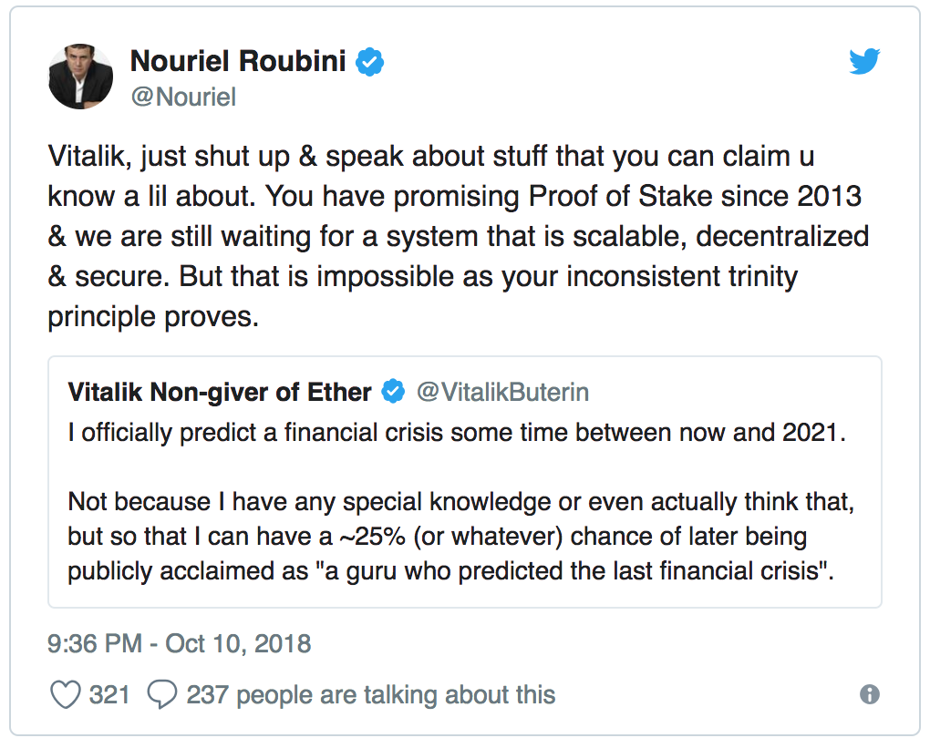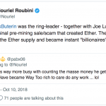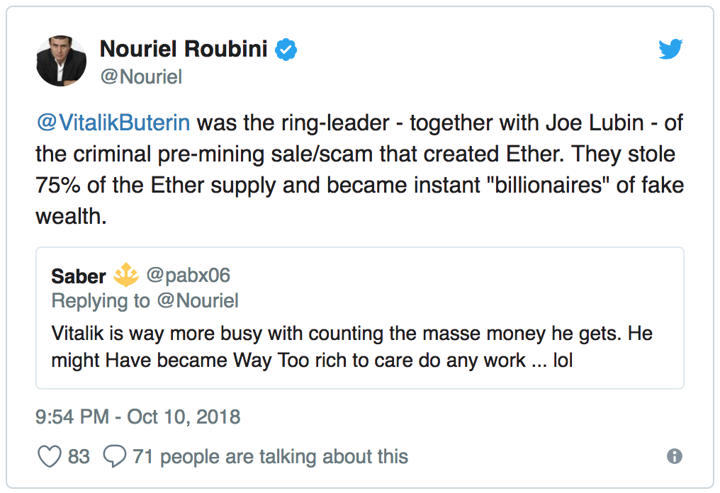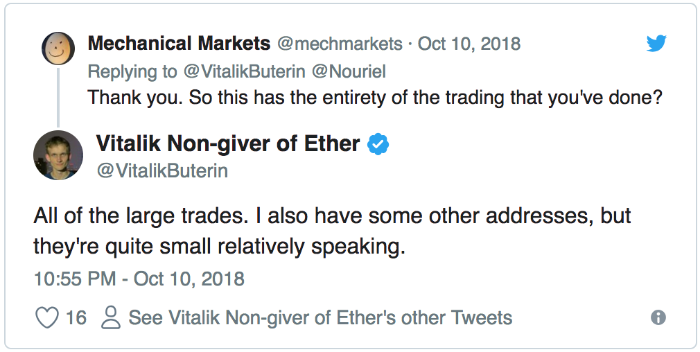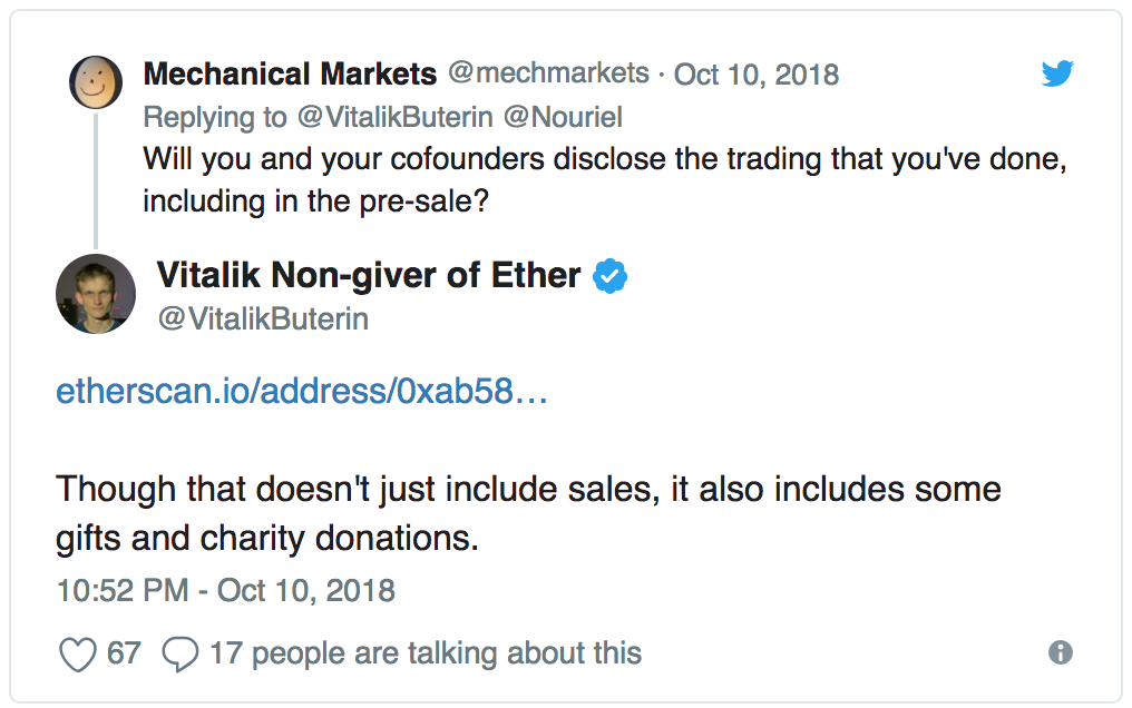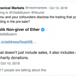 Buterin odhalil adresu peňaženky ako reakciu na post zo sociálnej siete. Na Twitteri profesor Nouriel Roubin z New York University tvrdil, že Vitalik je miliardár vďaka tomu, že si ponechal mnoho tokenov ešte predtým, než boli dostupné verejnosti, alebo si mince predťažil.
