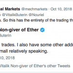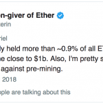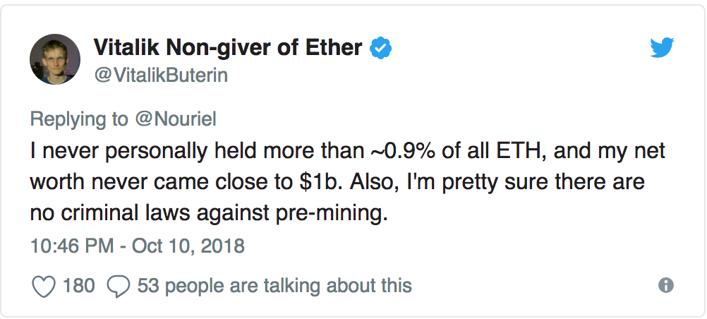 Tvorca druhej najväčšej kryptomeny v príspevku na Twitteri napísal, že nikdy nevlastnil viac než 0,9 % Etherea. Bolo teda treba uviesť veci na pravú mieru. Rozhodol sa zverejniť odkaz s adresou svojej digitálnej peňaženky, a ukázať tak verejnosti, či sú fámy pravdivé.