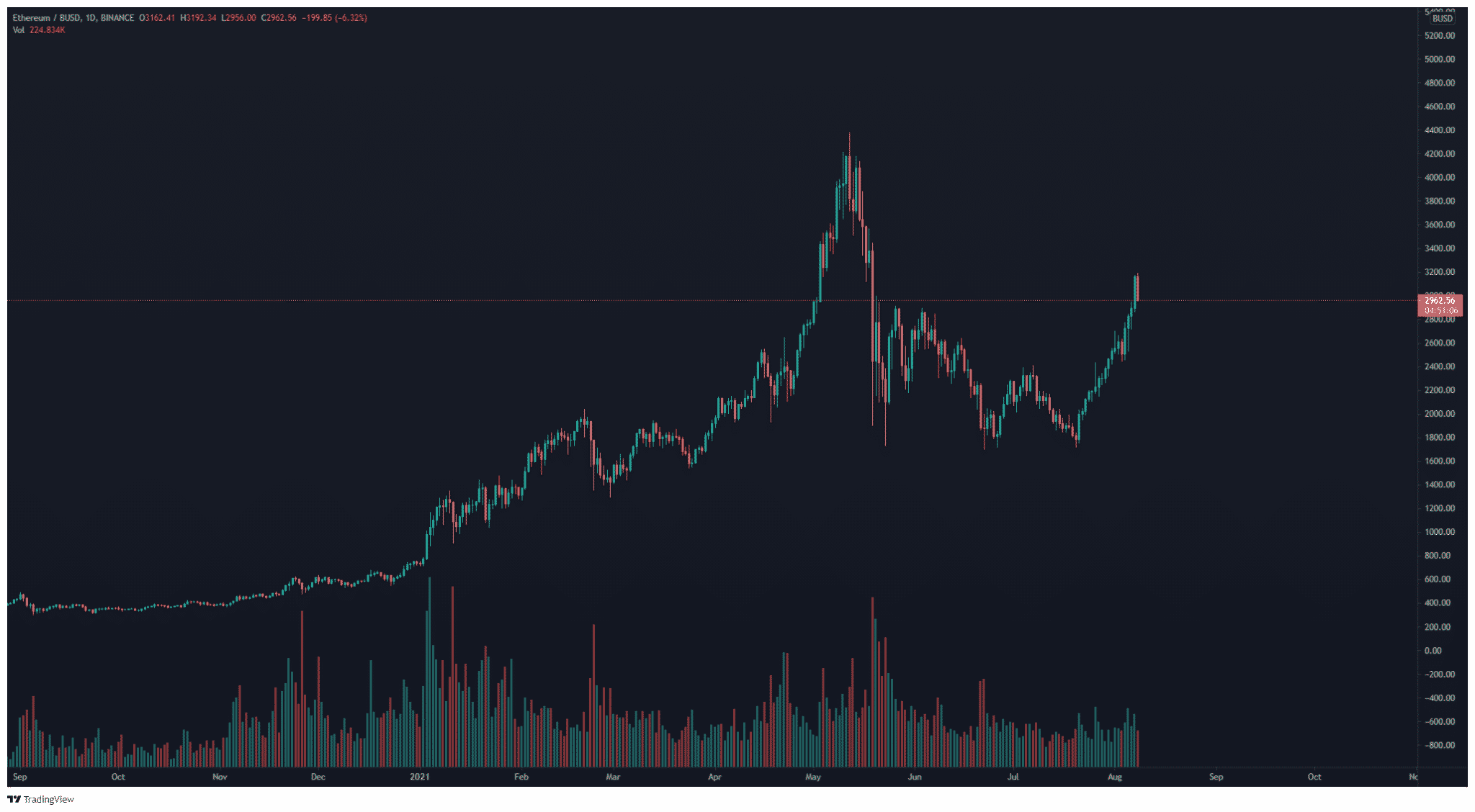 Druhá najväčšia kryptomena Ethereum zažíva po májovej korekcii veľmi dobré obdobie. Svedčia o tom významné fundamenty, ktoré dokázali cenu vystreliť tesne nad hranicu 3 000 USD.