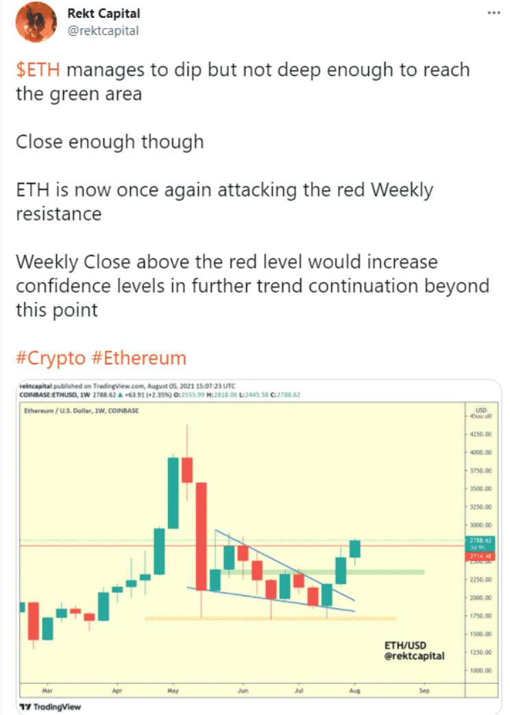 Jedným z najpopulárnejších analytikov je bezpochyby Rekt Capital. Ten na svojom twitterovom účte vyzdvihol najmä týždňovú úroveň rezistencie ETH. Táto dôležitá úroveň musí byť prekonaná, aby ďalej pokračoval bullrun.