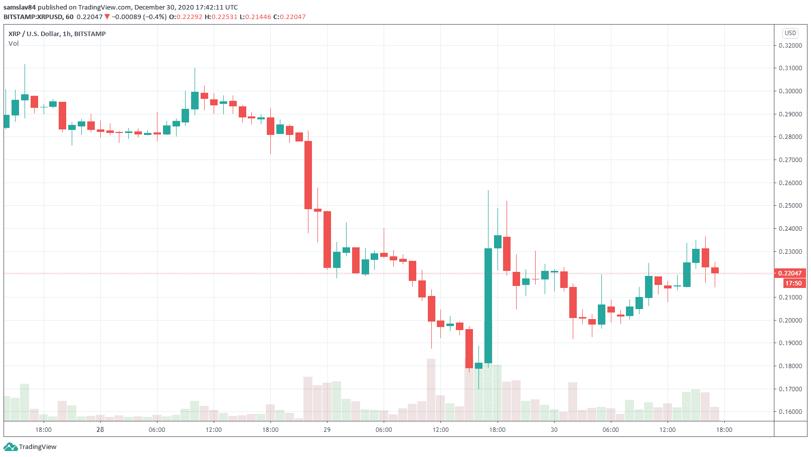 XRP dnes konsoliduje po masakre z posledných dvoch dní, keď sa cena tohto tokenu prepadla z 31 centov na nové minimum 17 centov. Aktuálne sa obchoduje za 22 centov a každý, komu sa podarilo kúpiť dip, teraz môže byť spokojný. Samozrejme, že menšia korekcia po takmer 50% prepade sa dala očakávať, no chytať dno môže byť nebezpečné. Pri XRP teraz človek nikdy nevie, či sa už odrazí, alebo klesne o ďalších 10%.