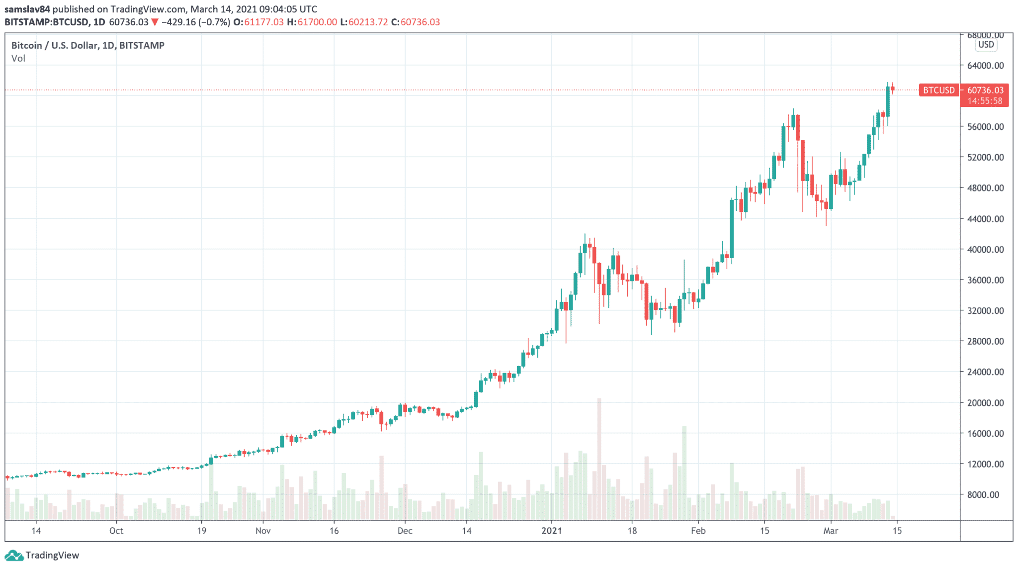 Nedávno sme sa vás v ankete opýtali, ako to teraz vidíte s Bitcoinom. V tom čase už vytvoril nové maximum na eurových pároch, no na dolárové ATH sme ešte stále čakali. Dočkali sme sa až včera, keď prvýkrát v histórii prekonal 60 000 dolárov.