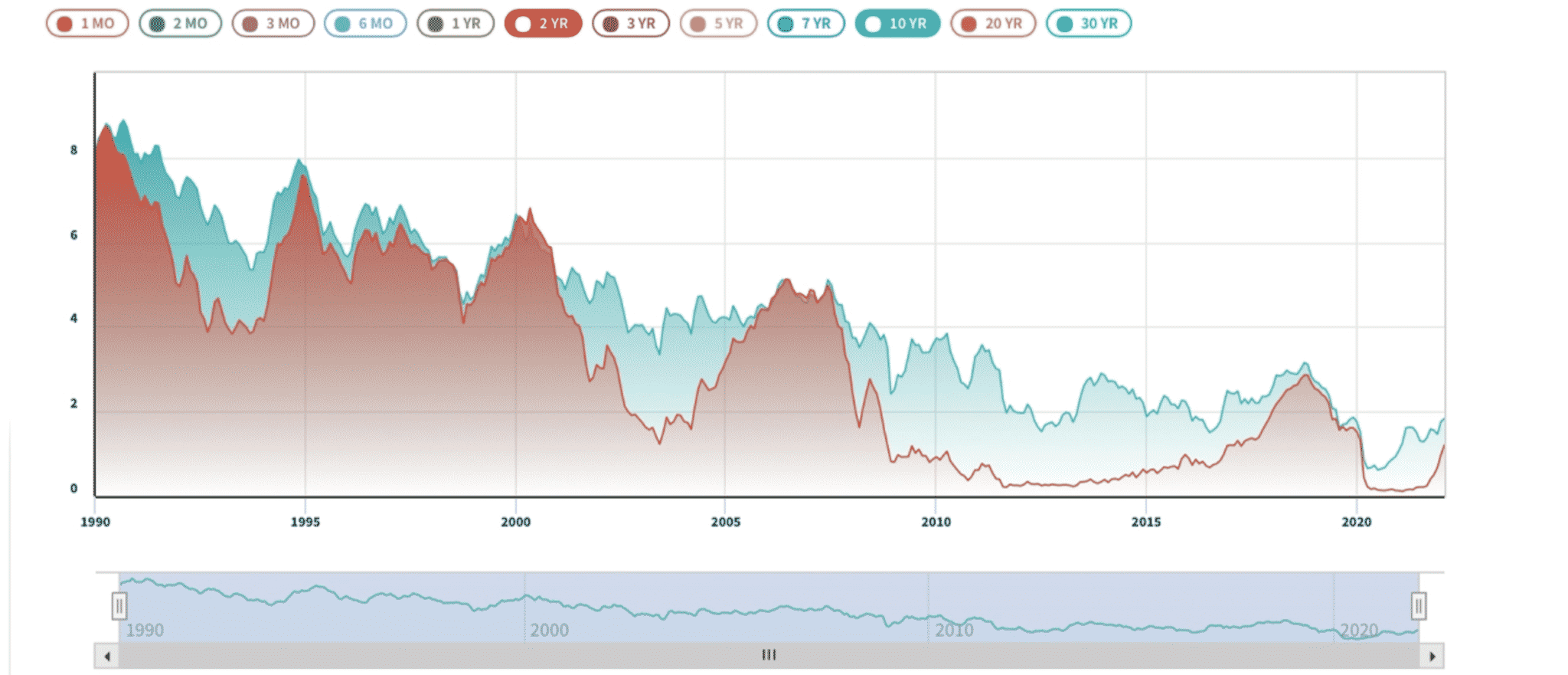 Agentúra Reuters nedávno uviedla, že „obavy z recesie sa výraznejšie prejavujú vo výnosovej krivke amerického ministerstva financií. Tá neustále klesá.”