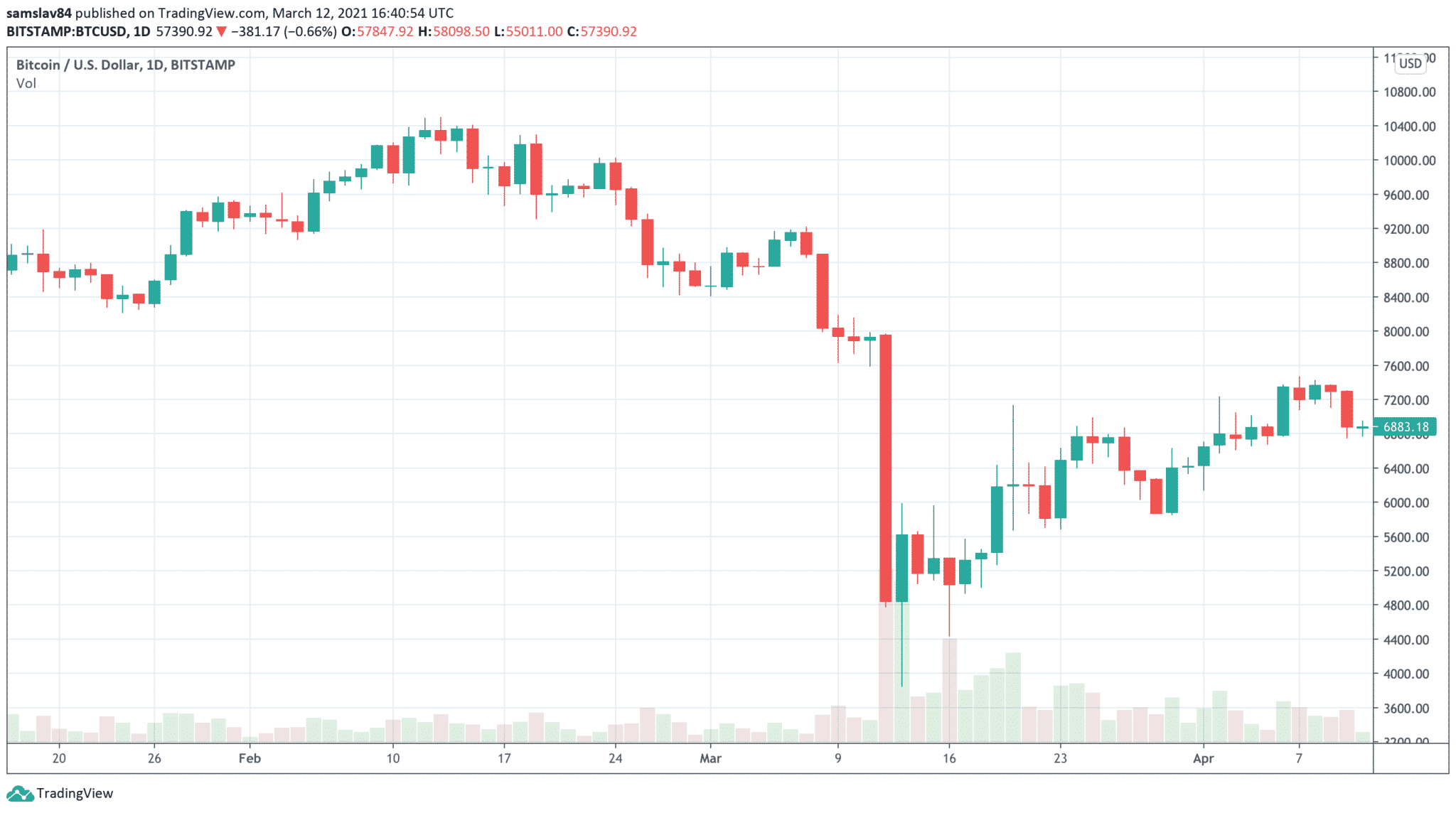 Krach Bitcoinu z 12. marca vošiel do histórie aj, ako (v tej dobe) najvyššia, červená svieca. Ešte ráno sa veselo obchodovalo za $8000 a večer trhy uzatvárali pod 5000 dolármi. Korekcia potom v piatok trinásteho pokračovala ešte nižšie, no Bitcoin nakoniec deň uzavrel v pluse.