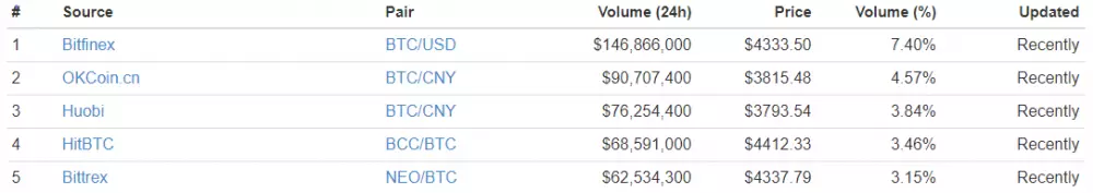 Na čo presne sa pozeráme? Nuž, ide o screen zo stránky coinmarketcap.com. Vidíte na ňom TOP5 Bitcoin búrz, čo do objemu. V piatom stĺpci si všimnite cenu, za ktorú sa Bitcoin na daných burzách vymieňal. Zatiaľ čo na Bitfinexe, HitBTC a Bittrexe kráľ kryptomien zaznamenal iba malý prepad na 4300-4400$, čínske burzy OKCoin a Huobi spievali inú pesničku. ~3800 dolárov! Teda viac než 12% rozdiel v cene. Toto je daň za dôverčivosť. Neskúsení obchodníci a malí investori v strachu predali úplne všetko a veľké čínske veľryby sa poriadne namastili.