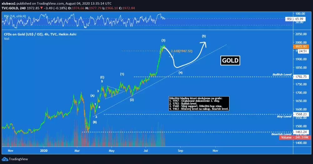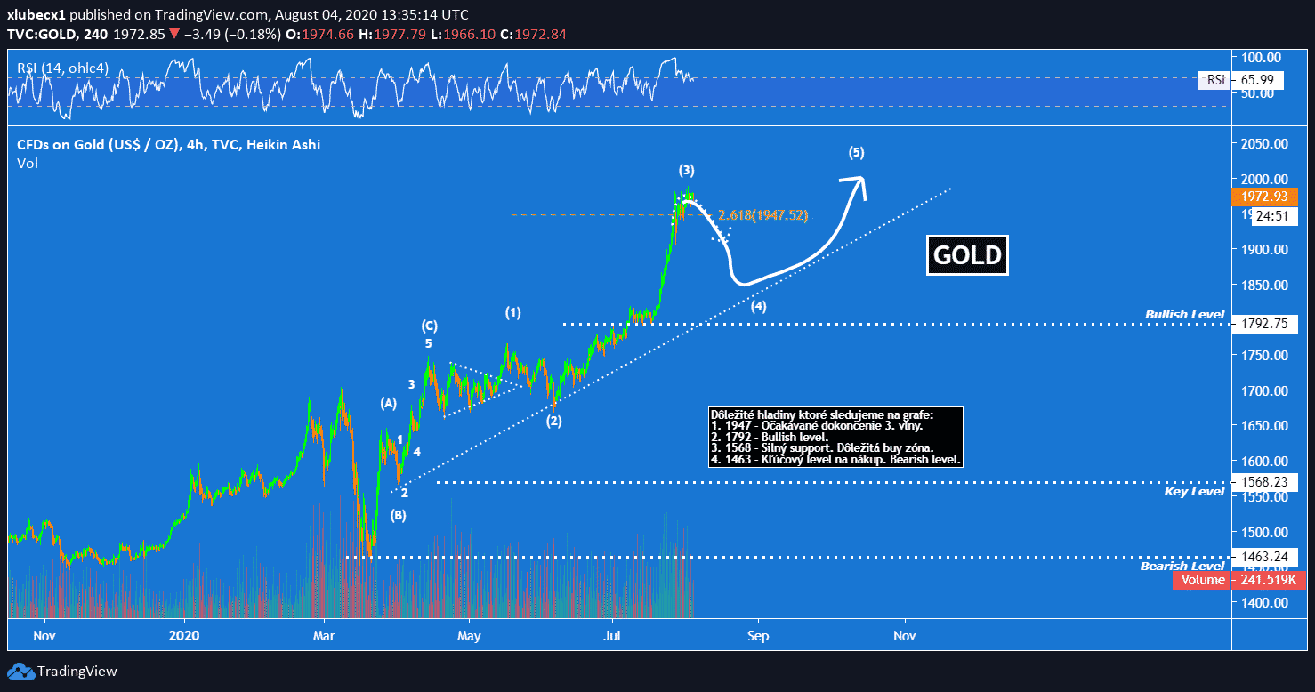 Niekoho možno veľký rast zlata prekvapil. Ja si však myslím, že ide o štandardný vývoj na trhu. Vždy počas krízy zlato rástlo. Je síce pravda, že okamžite po vypuknutí predchádzajúcich globálnych recesií zaznamenali aj komodity veľké prepady. Išlo však iba o krátkodobé predaje. Niečo podobné môžeme vidieť aj na grafe. Zlato stratilo za jeden mesiac približne 20 %. Následne sa vytvorilo „V” dno a odvtedy rastie. ATH, čiže hodnotu okolo 2 000 USD pravdepodobne bez problémov prelomí. Podľa teórie Elliot wave a cyklov sa nachádza iba v 3. vlne a po korekcii čakám, že môže smerovať k 2 500 USD. Pokiaľ by bola recesia ešte horšia ako je teraz, tak bullish trend môže byť ešte dlhší v porovnaní s rokom 2009, kedy bola predchádzajúca kríza. Zlato taktiež rástlo viac ako 3 roky.