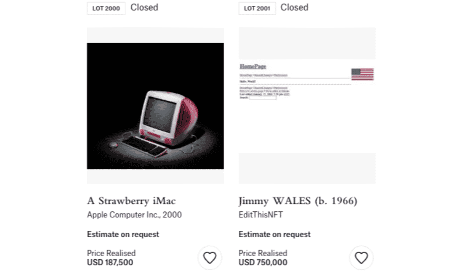 Jedna z najväčších aukčných domov na svete, Christie’s, sa presťahovala do odvetvia NFT začiatkom roka 2021. Vo februári oznámila aukciu svojho vôbec prvého „čisto digitálneho umeleckého diela” od digitálneho umelca Beeple. Kus NFT spoločnosti Beeple „Everydays: The First 5000 Days” sa v marci predal za viac ako 69 miliónov dolárov a stal sa jedným z najdrahších NFT na svete.