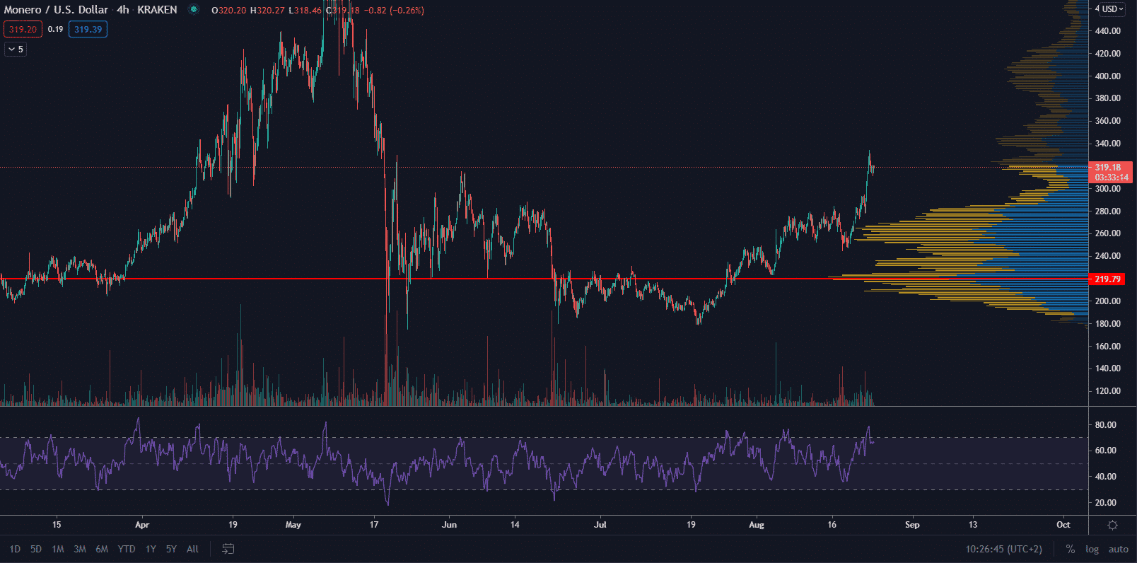 Po spustení Monero Atomic Swaps zaznamenal XMR nárast a jeho cena vzrástla z približne 265 dolárov v deň uvedenia na trh na 331 dolárov. V čase písania článku sa kryptomena zameraná na súkromie obchoduje za 319 dolárov. Ide tak o 2,4-percentný pokles za posledných 24 hodín. Po silnom vzostupnom trende sa XMR za posledných 30 dní zvýšilo o viac ako 50 %.