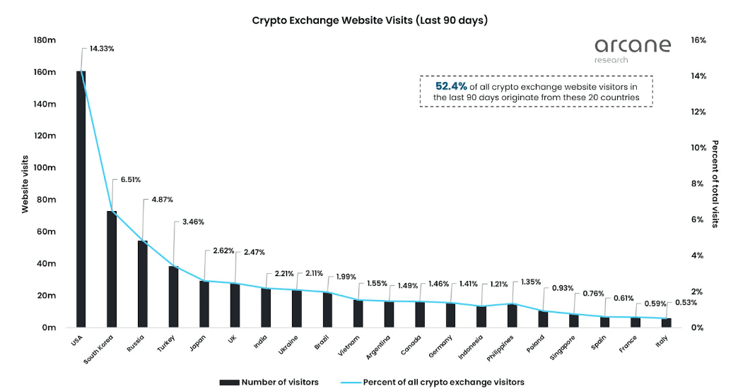 Obchodníci, ktorí pochádzajú zo Spojených štátov, tvoria najväčší podiel globálnych návštevníkov webových stránok, ktoré sa zameriavajú na kryptomenové burzy. Údaje sú zverejnené za posledných 90 dní, pričom obchodníci z USA tvoria približne 14 % podľa údajov spoločnosti SimilarWeb, zdieľané Arcane research z dňa 24. augusta.