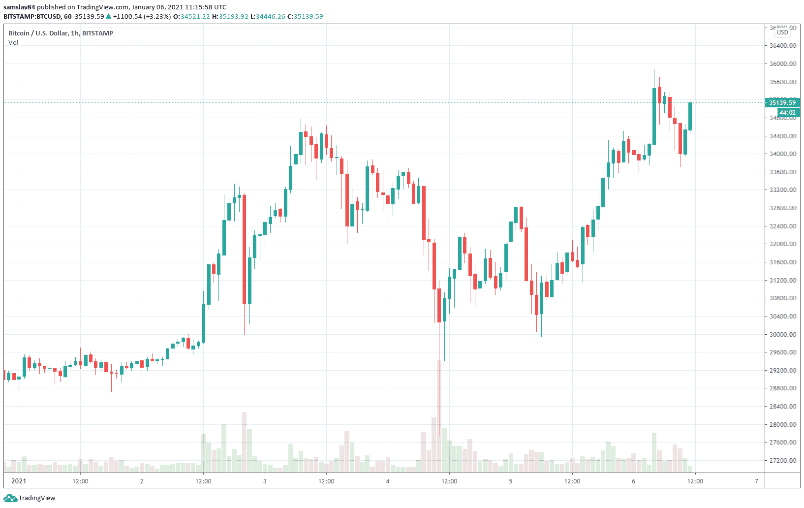 Bitcoin po zaváhaní z posledných dvoch dní pokračuje v raste a udržiava si tempo, ktoré nastolil od začiatku roka. Za posledných 24 hodín jeho cena stúpla o viac než 10% a zo včerajšieho dna na cene 30 000 $ sa dostal až na aktuálnych 35 000 $. Dnes ráno okolo piatej dokonca dosiahol nové historické maximum. Na niektorých burzách otestoval hladinu 36 000 $. Na burze Bitstamp, z ktorej berieme dáta, sa zastavil 100 $ pod okrúhlou cenou.