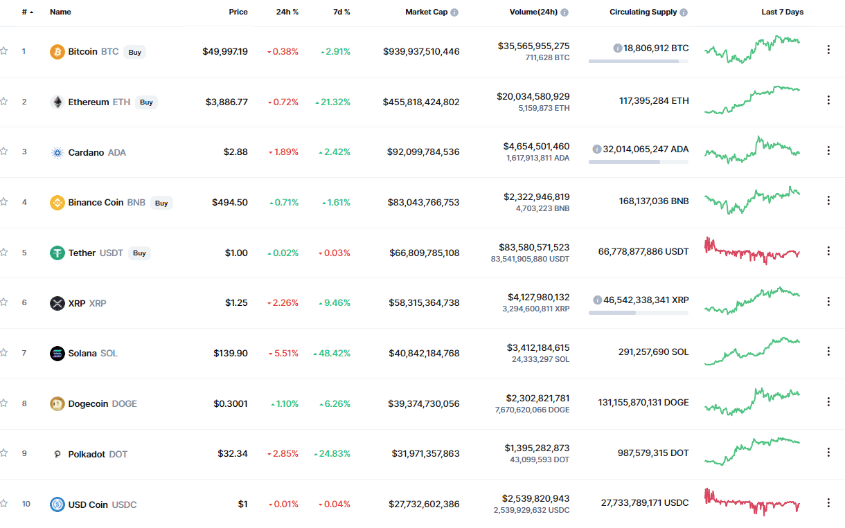 Podľa údajov spoločnosti CoinMarketCap za posledných sedem dní v čase písania článku BTC vykázal 2,91 %. Na porovnanie, altcoiny toto číslo prevyšovali, pričom SOL za týždeň narástol o 48,42 %, ETH o 21,32 % a DOT o 24,83 % v rovnakom čase. SOL a ADA nedávno tiež zaznamenali nové ATH.