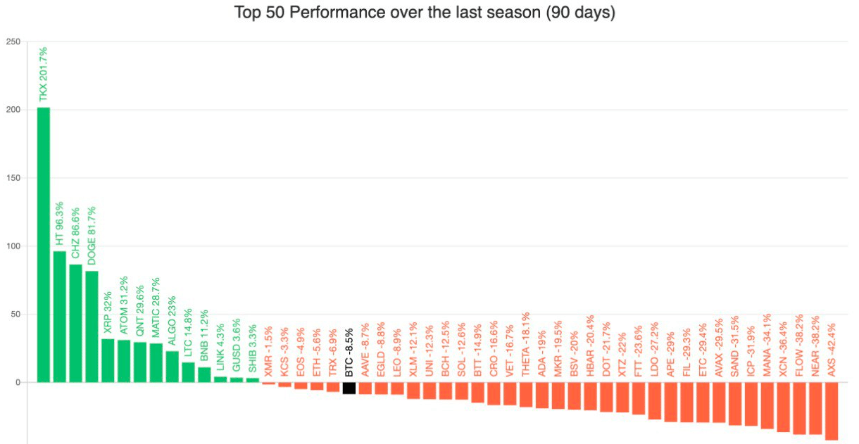 Za kryptomeny s najvýraznejšími výsledkami súčasnosti sú považované projekty DOGE a SHIB. Dogecoin ťaží najmä z nedávnych krokov Elona Muska. Za posledných 90 dní získal tento token zisk viac ako 81 %. Podobné výnosy zaznamenal aj token SHIB. Okrem toho dosiahol oslnivé výsledky natívny token blockchainu Ripple XRP, ktorého vyhliadky v súdnom procese proti SEC-u sú čoraz pozitívnejšie. Na čele tohto rebríčka stoja menej známe projekty TKX a HT. Ak sa dominancia bude naďalej držať pod hranicou 40 %, altcoiny môžu naďalej rásť.