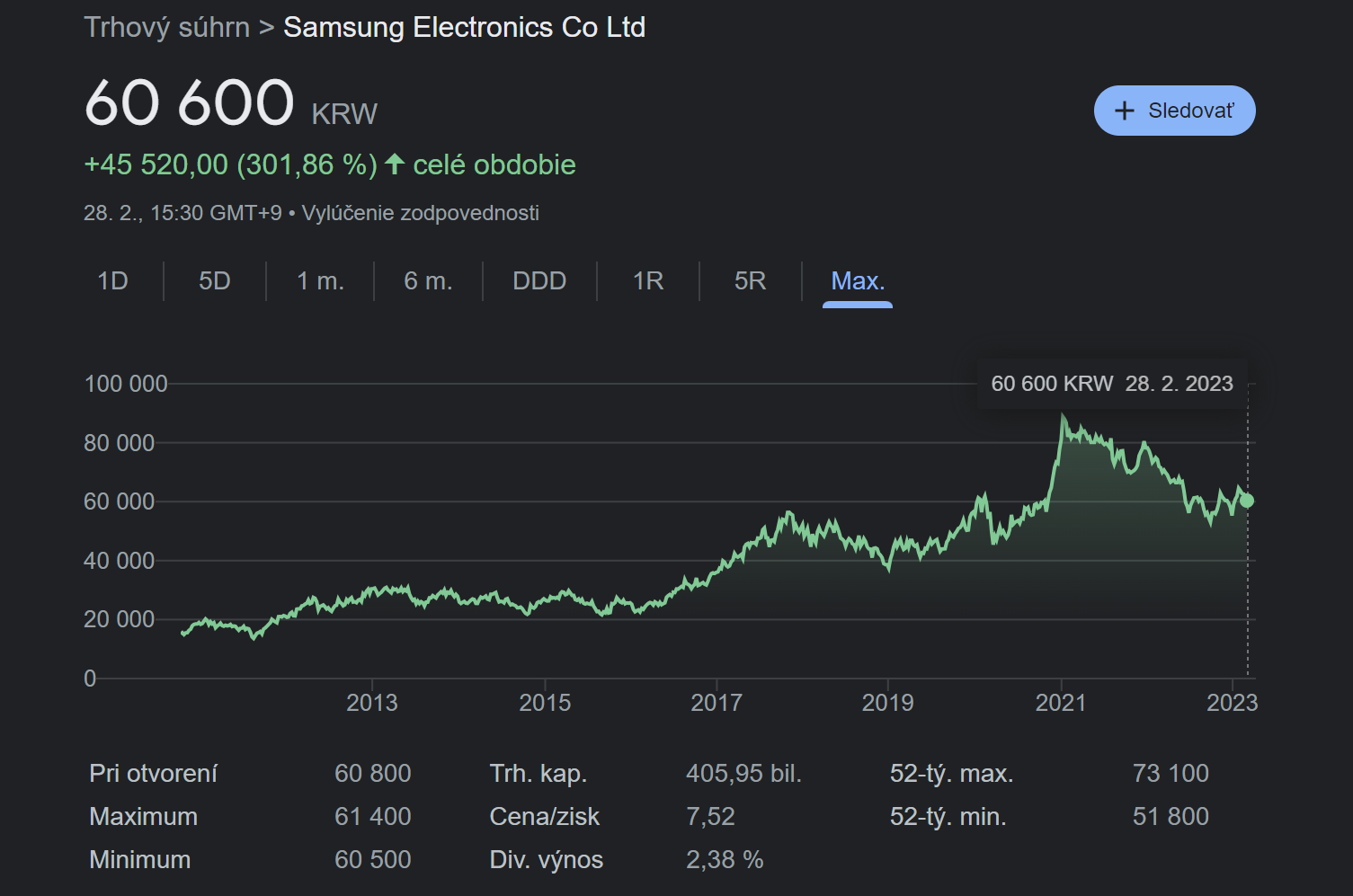 Samsung Electronics je juhokórejská nadnárodná spoločnosť, ktorá sa špecializuje na výrobu mobilov a elektroniky. Posledných 10 rokov sa stabilne radí vo svojej oblasti ku popredným svetovým firmám. Pokiaľ hľadáte stabilnú, dlhodobo rastovú spoločnosť, tak určite do tejto kategórie môžeme zaradiť aj Samsung.