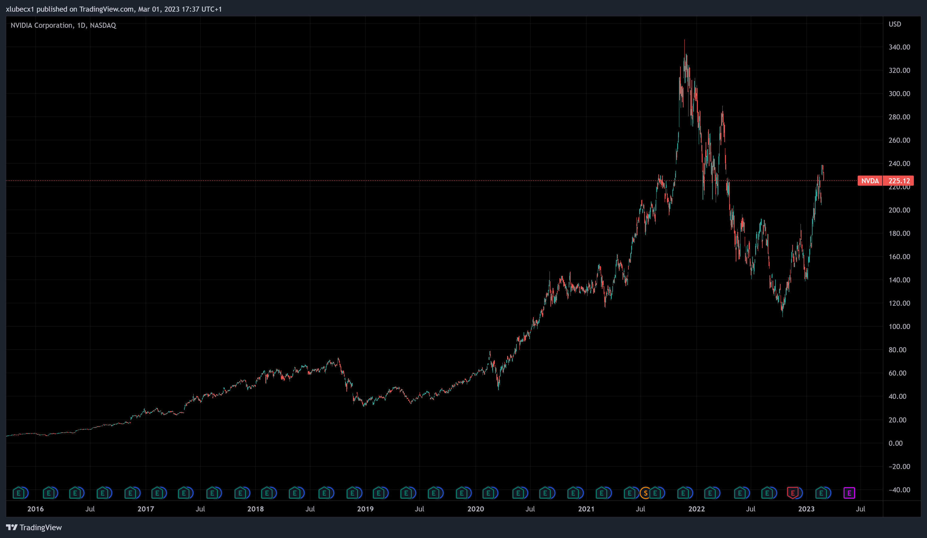 Spoločnosti sa tento rok začína opäť dariť. Od dna akcie vzrástli o viac ako 100 %. Aktuálne sa pohybujú na hodnote 225 dolárov. Pri súčasnom trende už tento rok môže NVIDIA byť na historickom maxime.