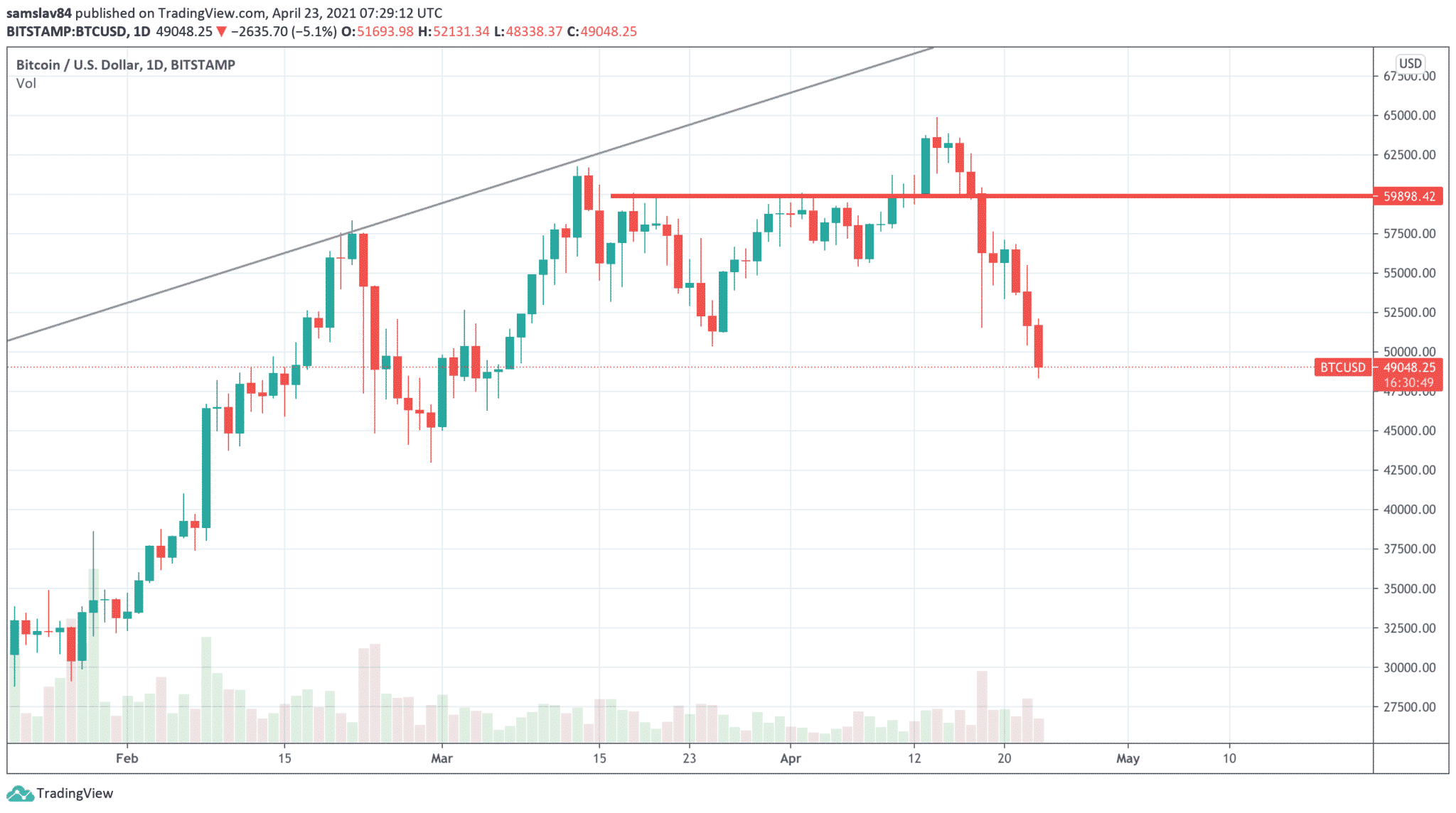 Aktuálna hladina – 47-50 tisíc USD, bola pre Bitcoin historicky veľmi priaznivá. Strávili sme na nej väčšinu apríla a inštitucionálni investori v tom čase nakúpili desiatky tisíc BTC. Spoločnosť Microstrategy, aktuálne najväčší inštitucionálny investor, nakupovala za $1,5 miliardy na cene 51 000 USD. O niečo nižšie do Bitcoinu pridala stovky miliónov firma Square.