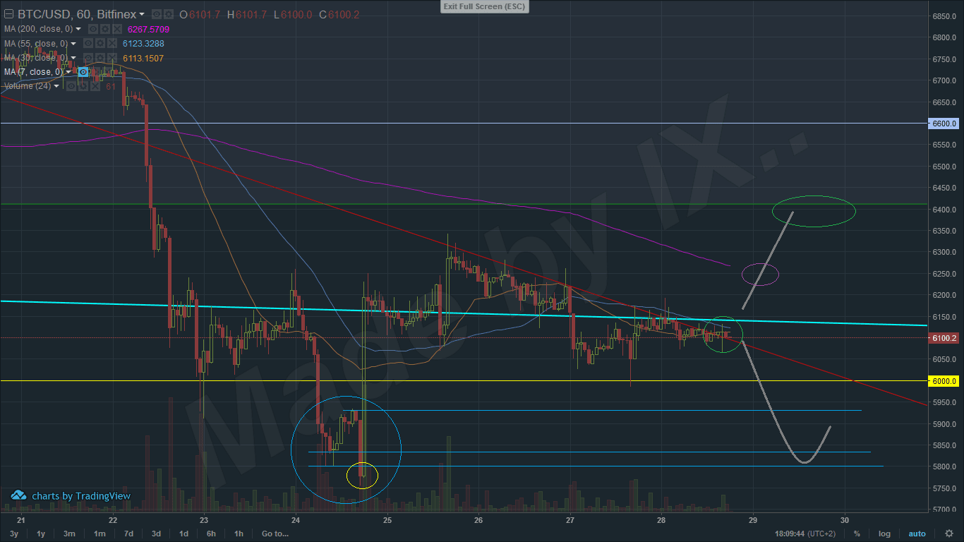 Včerajšia analýza BTC/USD na webe Trading11 ukazovala dve možnosti. Jednak tu bola možnosť prerazenia dlhodobej klesajúcej trandline (azuro) a následné stúpanie k rezistencii na 6400$. Táto možnosť bola na prvý pohľad celkom zaujímavá. Hlavne niektorí optimisti už vyhlasovali, že pod 6k nikdy nepôjdeme. Našťastie, obchodníci na Trading11 sú realisti. K prerazeniu azuro trendline nedošlo a zvíťazil tak scenár A. Ideme dole.