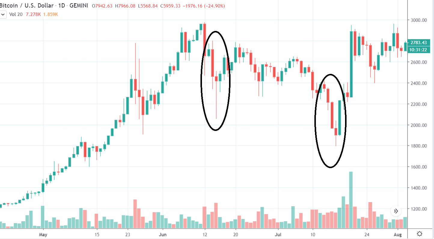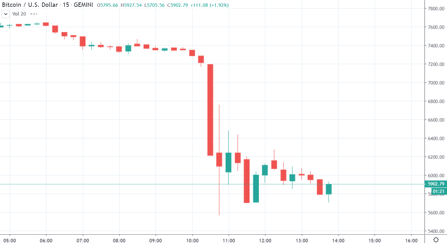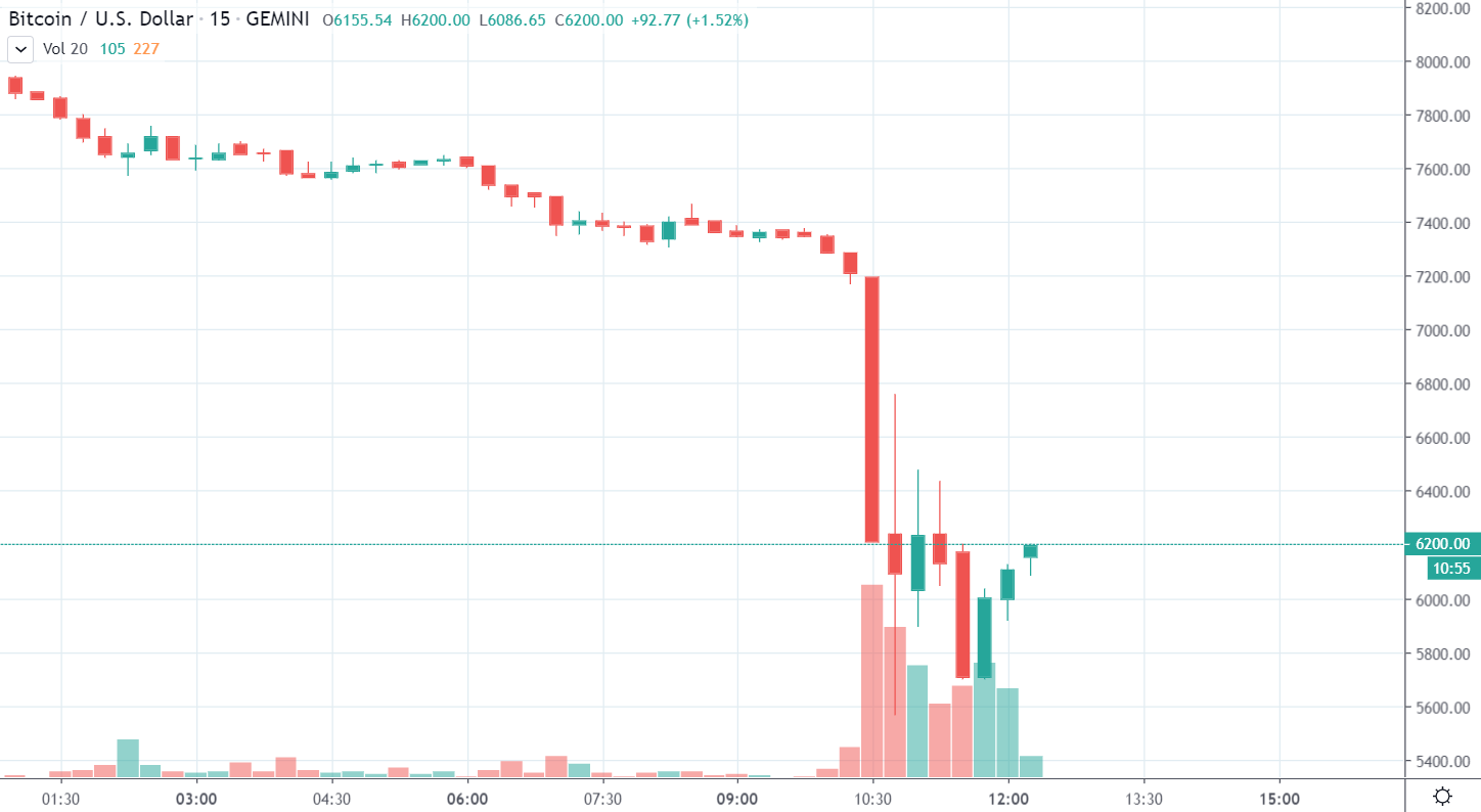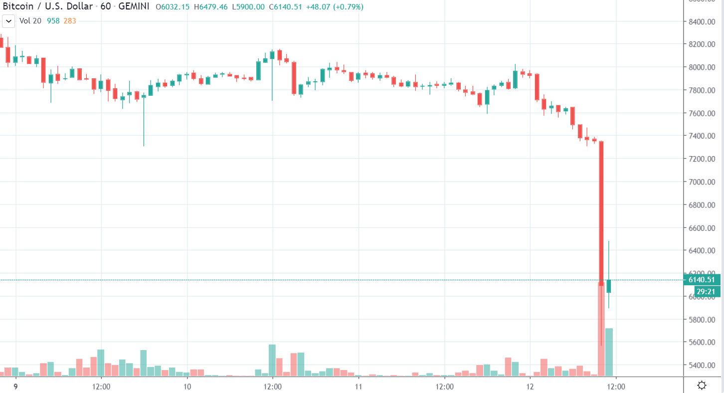Pravdepodobne kombinácia mnohých faktorov. Veľa ľudí malo na 7000 $ nastavené stoplossy resp. tam boli zlikvidovaný. Málokto totiž veril, že pôjdeme tak nízko. Likvidácie účtov následne spôsobili flash crash a tak sme sa ocitli na 5500 $.