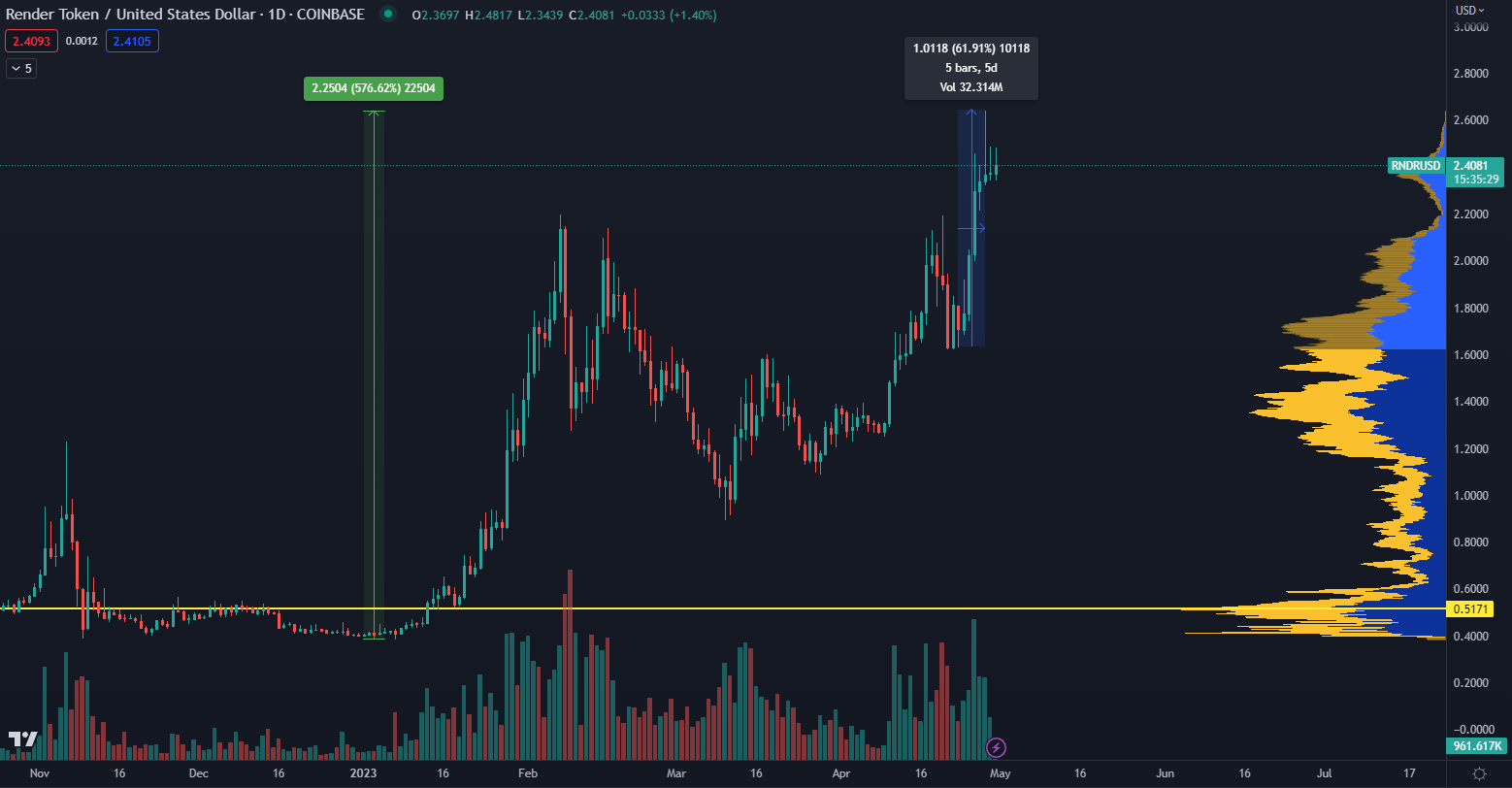 Ako vidíme na grafe nižšie, cena RNDR dokázala vytvoriť od 1. januára zhodnotenie až 576 % v najvyššom bode, ktorý bol dosiahnutý 28. apríla. Trhová cena stúpla z úrovne 0,40 dolára na súčasných 2,40 dolárov. Závratne sa zvýšil aj objem obchodovania, čo je základný predpoklad každého zdravého konzistentného rastu.