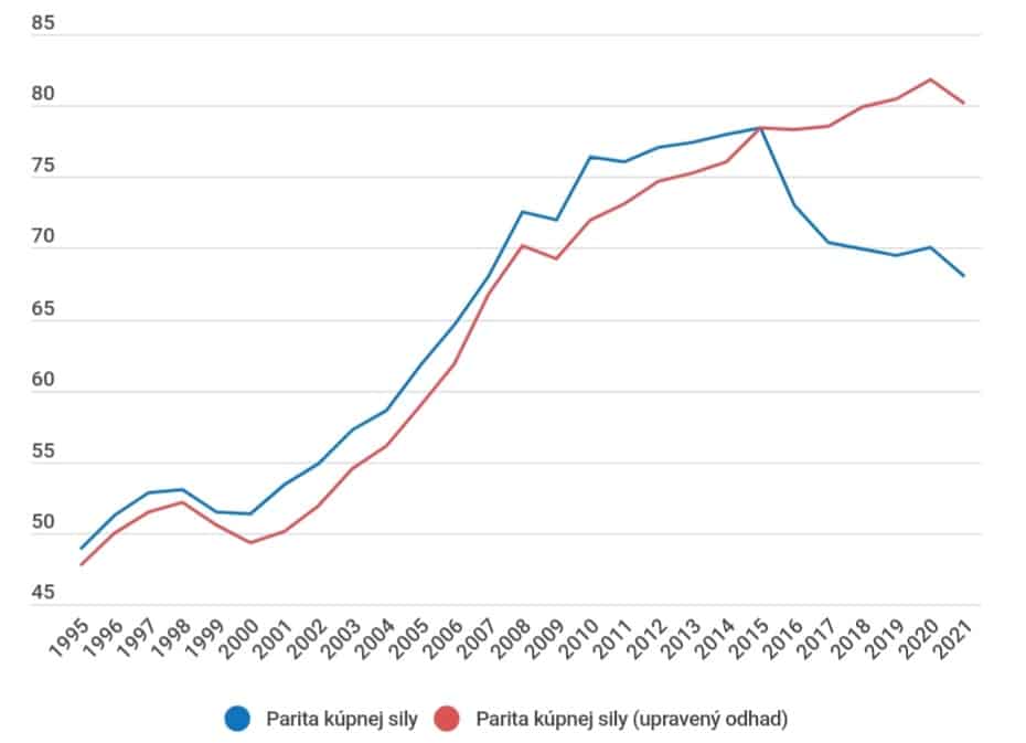 V posledných rokoch tak môžeme jasne vidieť, že sa životná úroveň od priemeru EÚ vzďaľuje. S týmto však môže niečo urobiť jedine naša vláda. Životná úroveň sa najčastejšie vyjadruje prostredníctvom ukazovateľa hrubého domáceho produktu, teda HDP. Ako môžete vidieť na grafe, NBS sa nemýli. Životná úroveň na Slovensku rapídne klesá.