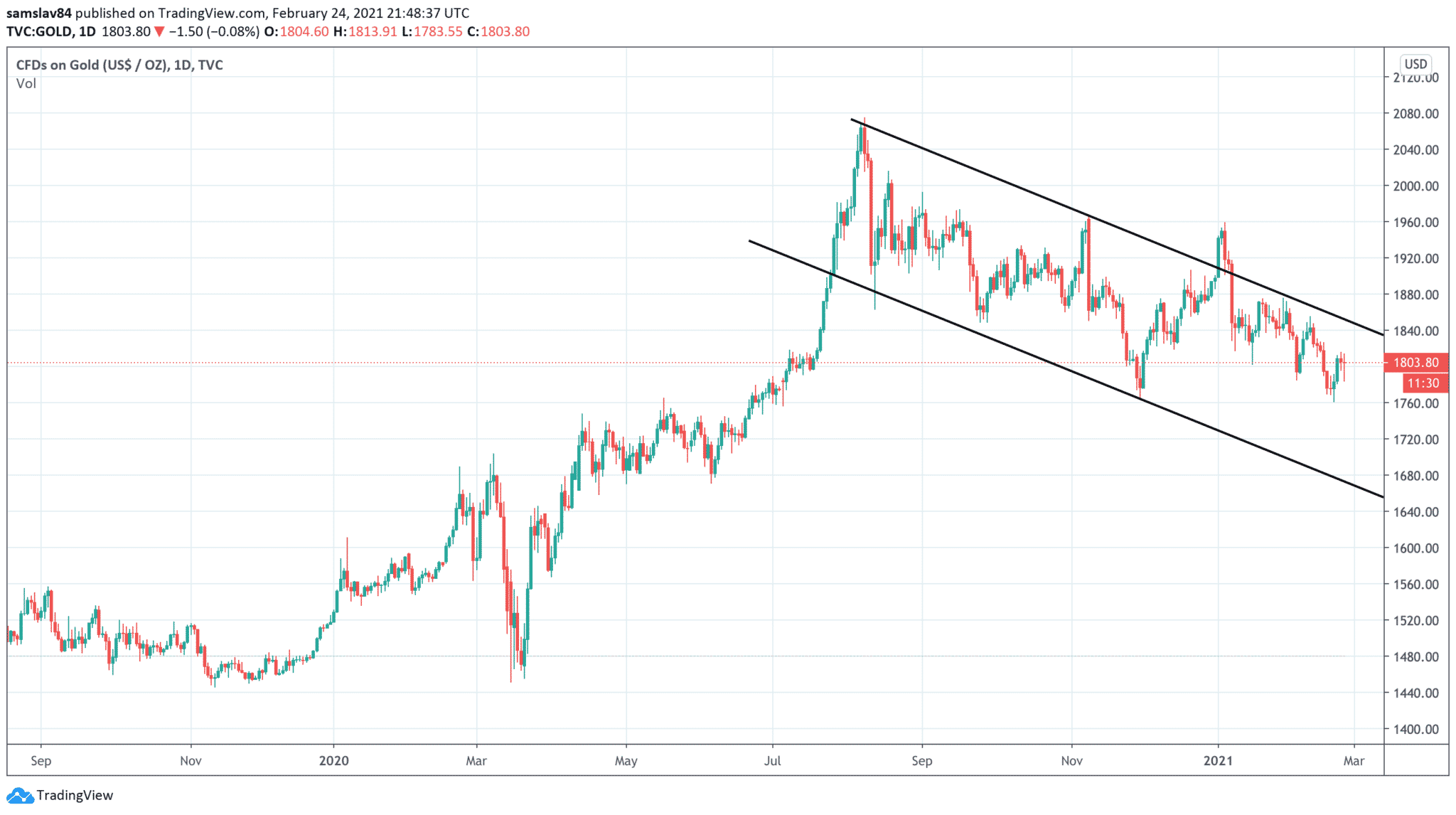 V auguste sme vás informovali, že zlato dosiahlo nové dolárové maximum. Prekonalo 1920 dolárov zo septembra 2011 a nakoniec sa vyšplhalo až na 2075 $. Tam zatiaľ svoju spanilú jazdu ukončilo a odvtedy je v korekcii. Pohybuje sa v klesajúcom obchodnom kanále a zatiaľ čo Bitcoin tento týždeň dosiahol svoje ATH, cena za uncu zlata klesla na 1765 $.