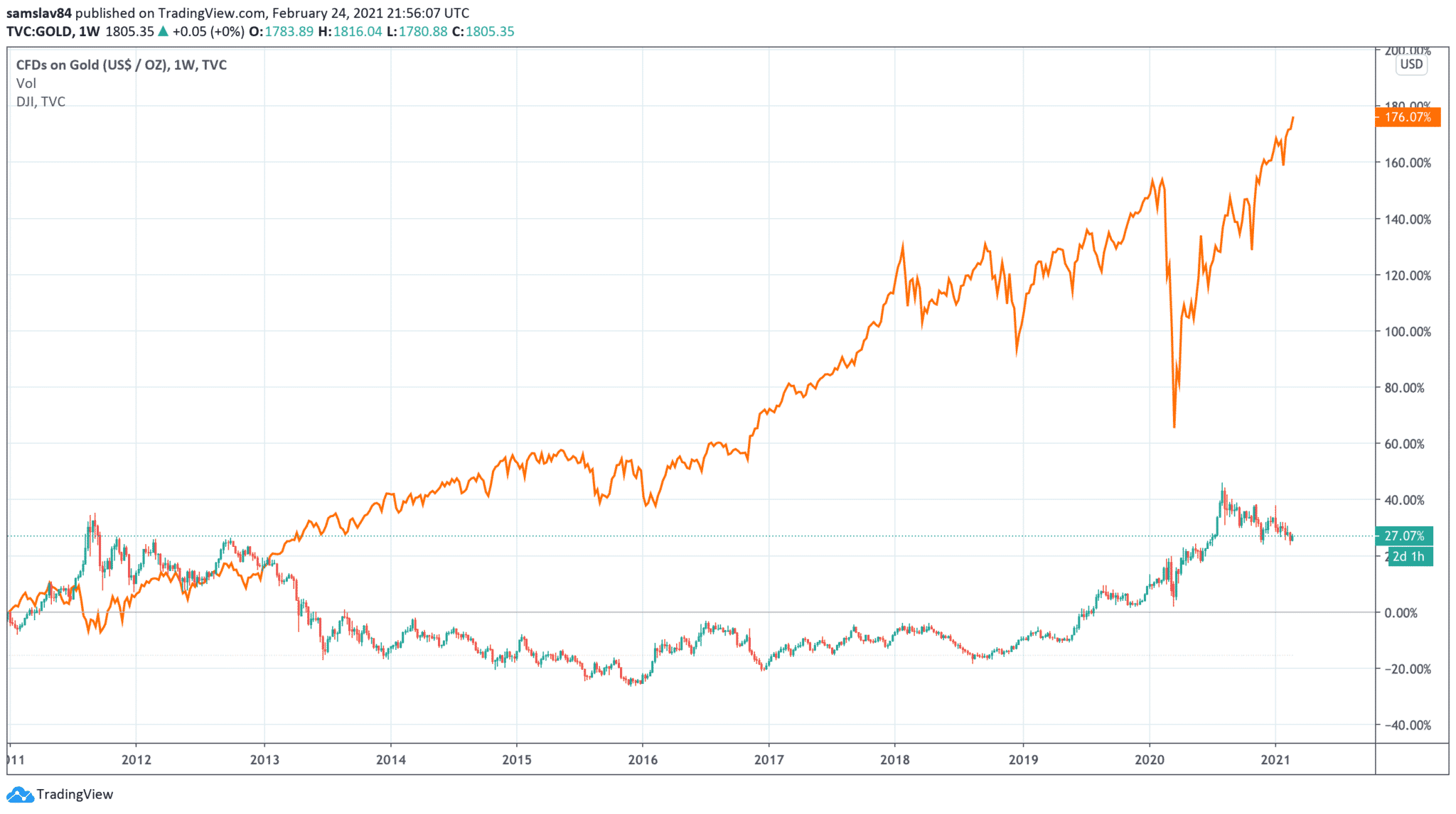 Zlato má dokonca nižšiu hodnotu, než v roku 1980, keď sa jeho hodnota vyšplhala na 678 dolárov. To bolo pred 40 rokmi! Ak to upravíme o infláciu, zlato vtedy stálo 2142 „dnešných“ dolárov. Zdá sa, že zlato periodicky dosahuje túto cenovku a následne začne opäť klesať.