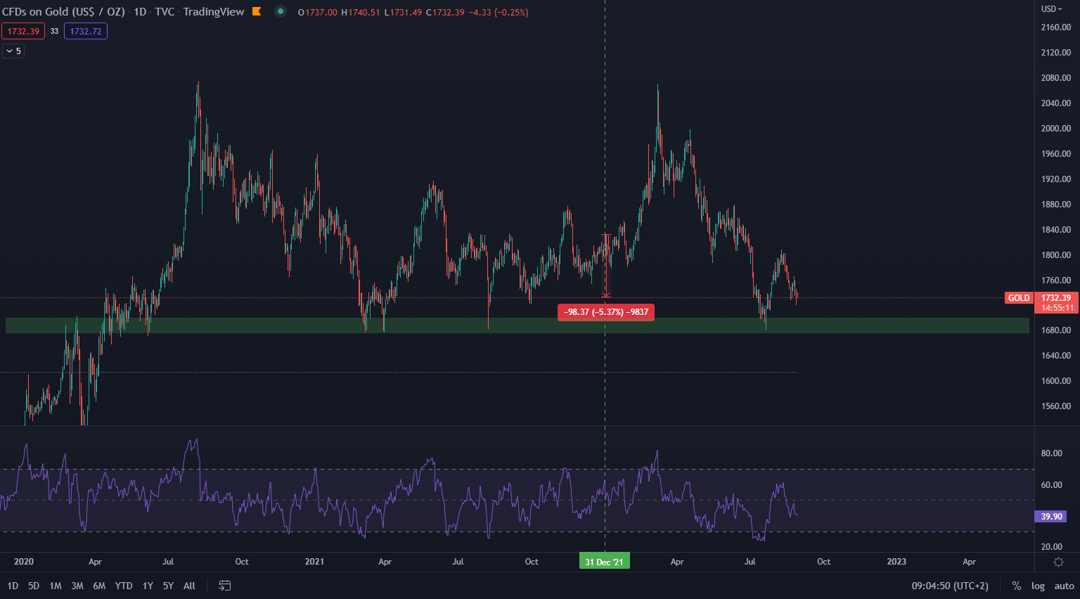 Graf nižšie zobrazuje aktuálnu trhovú cenu zlata z dňa 30. augusta. Zlato sa obchoduje na cenovej úrovni 1 730 dolárov a od začiatku marca neustále klesá. Od 8. marca cena klesla o zhruba 16,50 %, čo je pomerne silný prepad za tak krátke obdobie. Počas celého roku 2022 však inflácia narastá, pričom od 1. januára cena klesla aktuálne o zhruba 5,37 %.