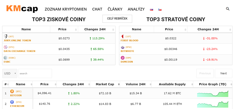 Nedávno sme na doméne KMcap.eu spustili nový web o kryptomenách. Naším cieľom je poskytnúť vám na ňom miesto, kde môžete nájsť všetky dôležité informácie o kryptomenách. Ide o akýsi česko-slovenský variant coinmarketcapu. Okrem dát o pohyboch cien kryptomien tam však môžete chatovať s ďalšími krypto-nadšencami, čítať články z Kryptomagazinu a Trading11 a postupne pridávame ďalšiu funkcionalitu.