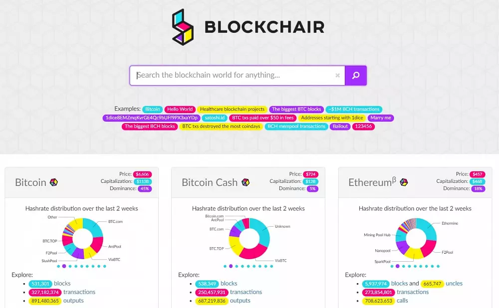 Blockchain.com. Jasná jednotka vo vyhľadávaní čo sa týka návštevnosti. Asi najznámejší explorer poskytuje svojim návštevníkom základné údaje, pričom vyhľadávať je možné na základe bloku či adresy. V jednoduchej a prehľadnej tabuľke zobrazuje okrem iného číslo posledných vyťažených blokov, čas, kedy boli vyťažené, počet transakcií a BTC, ktoré obsahovali, či pool, ktorý ho vyťažil.