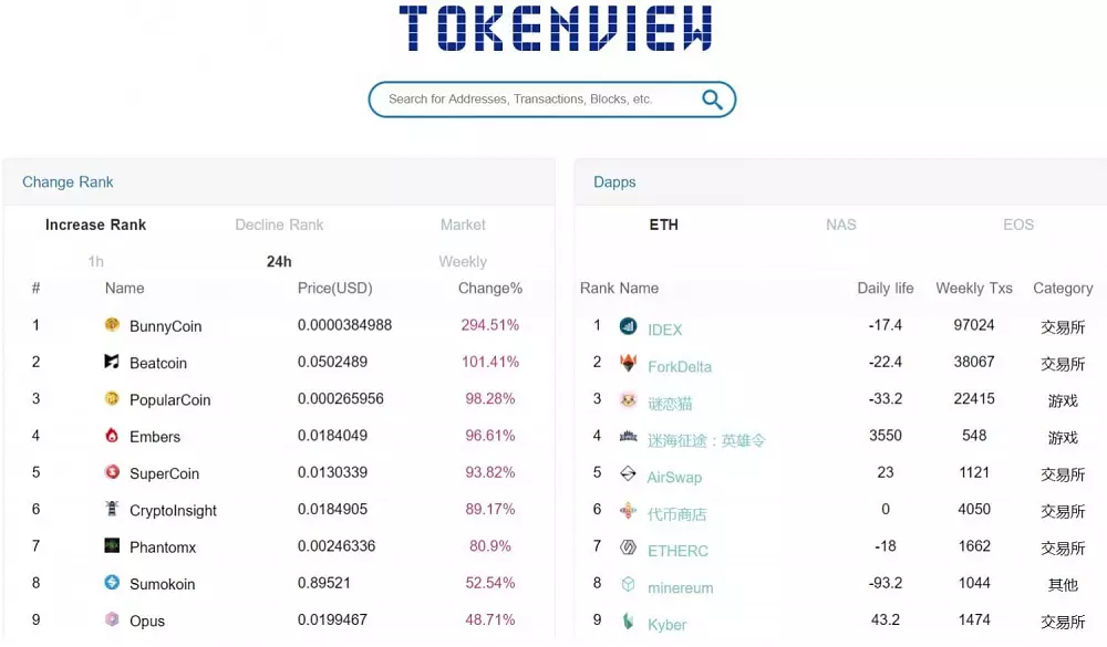 Tokenview.com, ktorý bol vyvinutý čínskym tímom len začiatkom tohto roka, ponúka možnosť vyhľadávania adries a transakcií pre široké množstvo coinov. Mimo tých najbežnejších ako Bitcoin, Ethereum a Litecoin umožňuje prehľad aj pre kryptomeny ako DASH, OmiseGO, Zcash či Dogecoin. Zaujímavosťou je aj implementácia grafu z Bitfinexu, ktorá je ale bohužiaľ v čínštine. Okrem vyššie spomenutých možností disponuje Tokenview aj sekciou nazvanou CoinBasic, v ktorej stručným popisom vysvetľuje princíp a fungovanie danej meny. Súčasťou prehľadu každej kryptomeny je aj zoznam najbohatších adries.