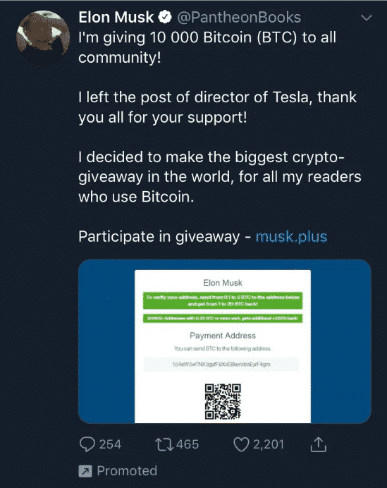 Podmienky sú jednoduché – pošli nám ľubovoľný obnos kryptomien na našu adresu a my ti obratom pošleme (najčastejšie) dvojnásobok späť. Dobrý deal, nie? Avšak poponáhľaj sa, platí to len pre prvých 100 ľudí! No a chamtiví nováčikovia sa idú roztrhať a posielajú tam bezhlavo všetko čo majú. Svoje prostriedky už samozrejme nikdy neuvidia.