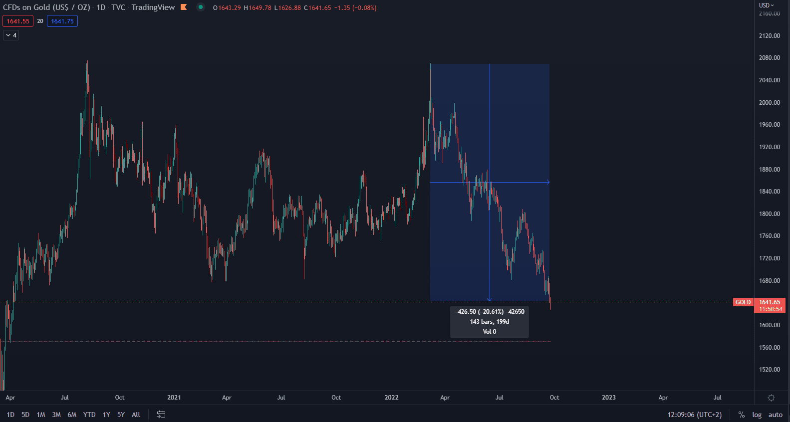 Ako vidíme na grafe vyššie, cena najznámejšieho drahého kovu sa nachádza v hlbokej korekcii. Zdá sa, že z krátkodobého hľadiska investori dávajú ruky preč aj od zdanlivo najbezpečnejšej investície v časoch inflácie.